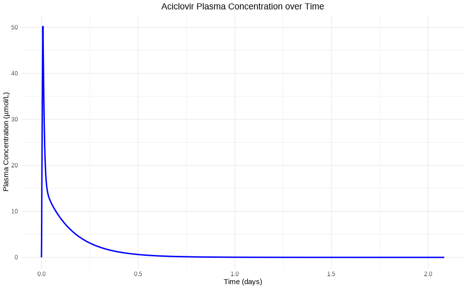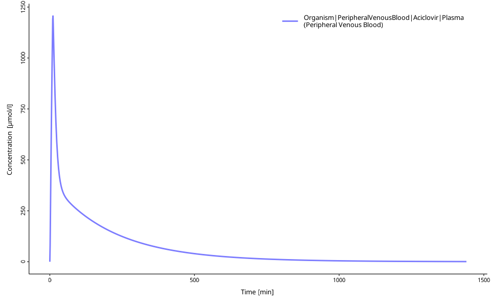 This example loads, runs, and visualizes a PBPK simulation. The plot shows the concentration-time profile for Aciclovir in plasma after IV administration.