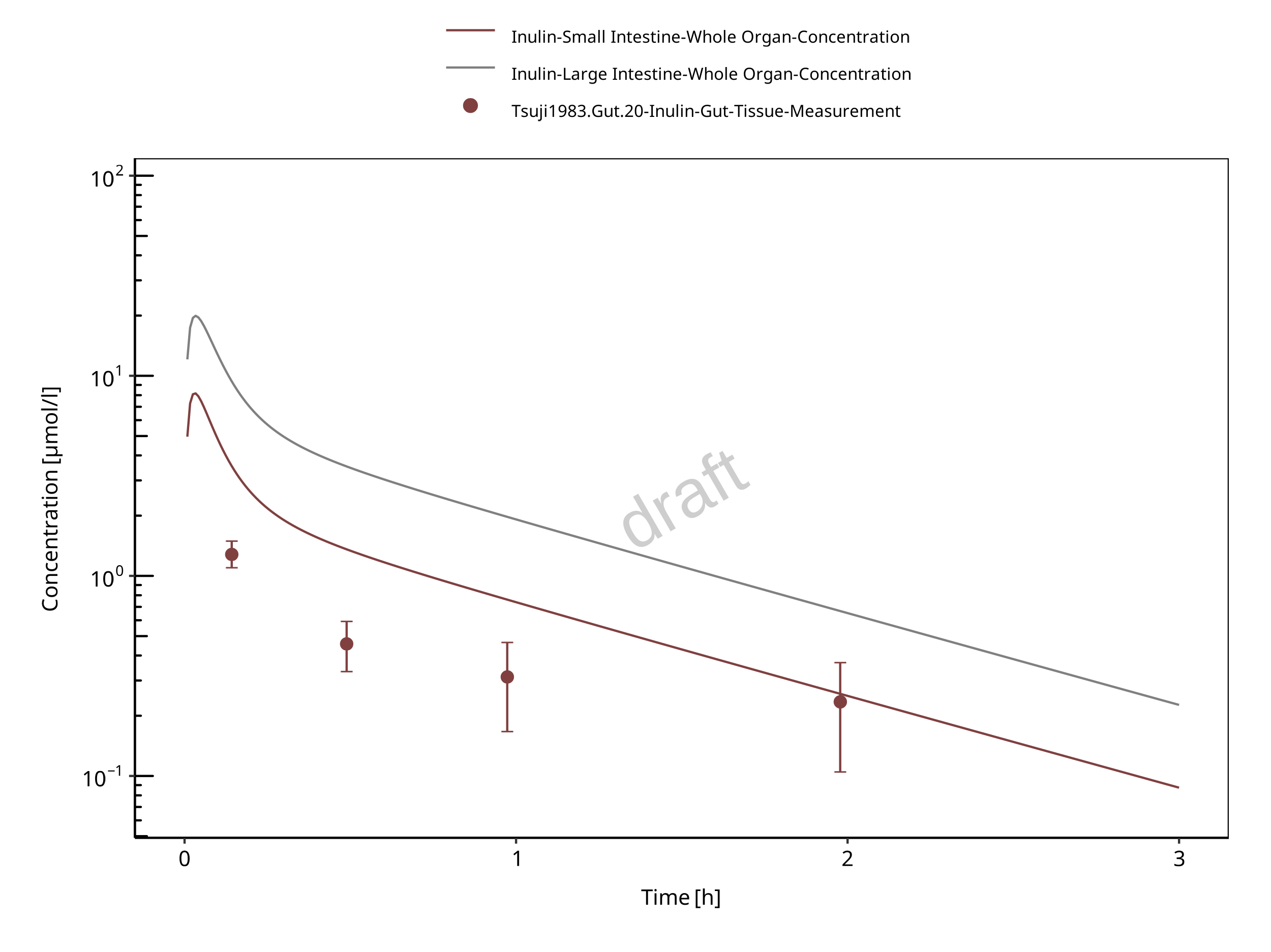 Experimentally, gut concentrations (from duodenum to the cecum) were measured (Tsuji 1983). In the present evaluation report, the experimental gut concentrations were compared to simulated organ concentrations for small and large intestine separately in the goodness of fit plots as well as in the concentration-time profile plot.