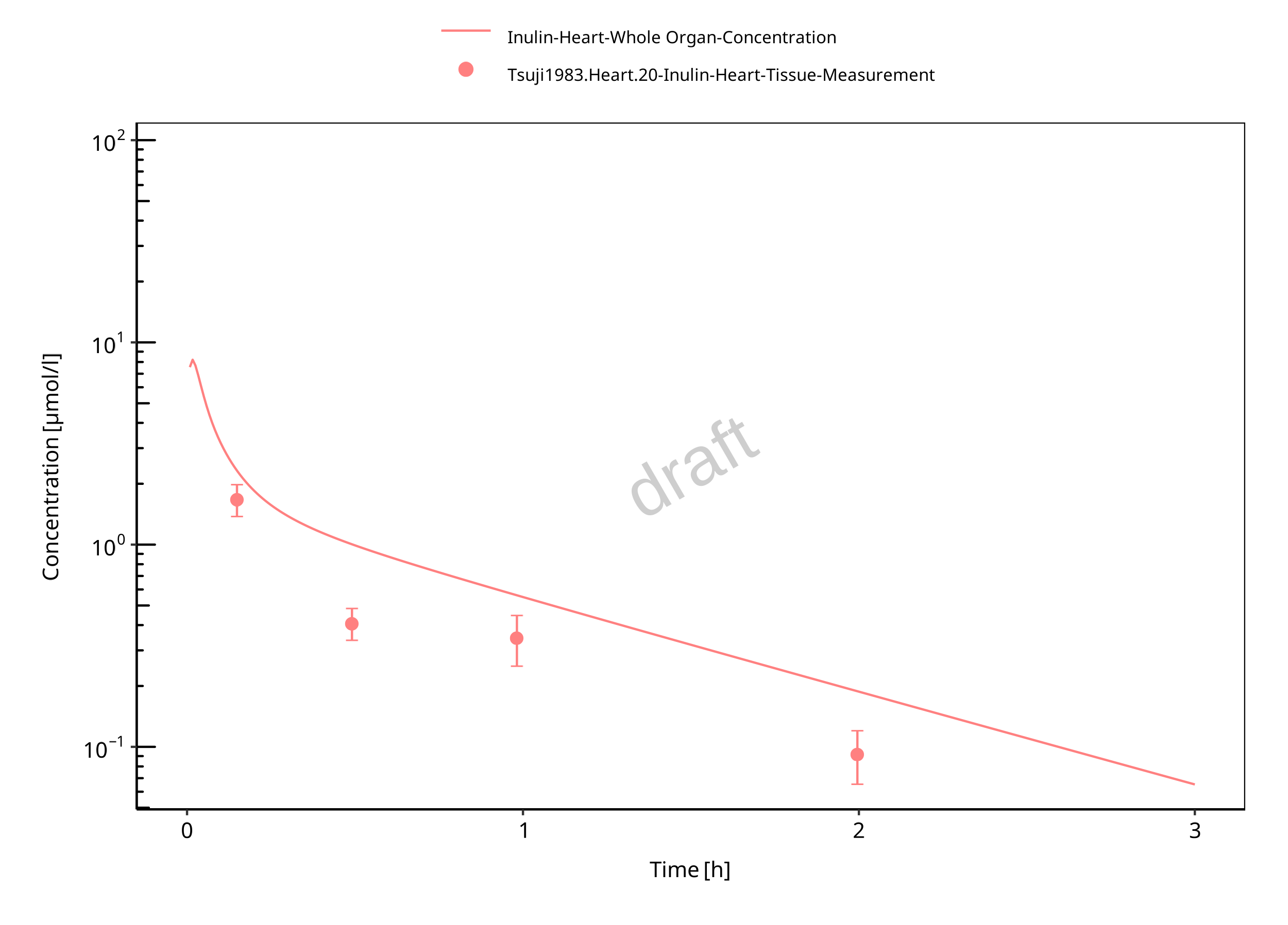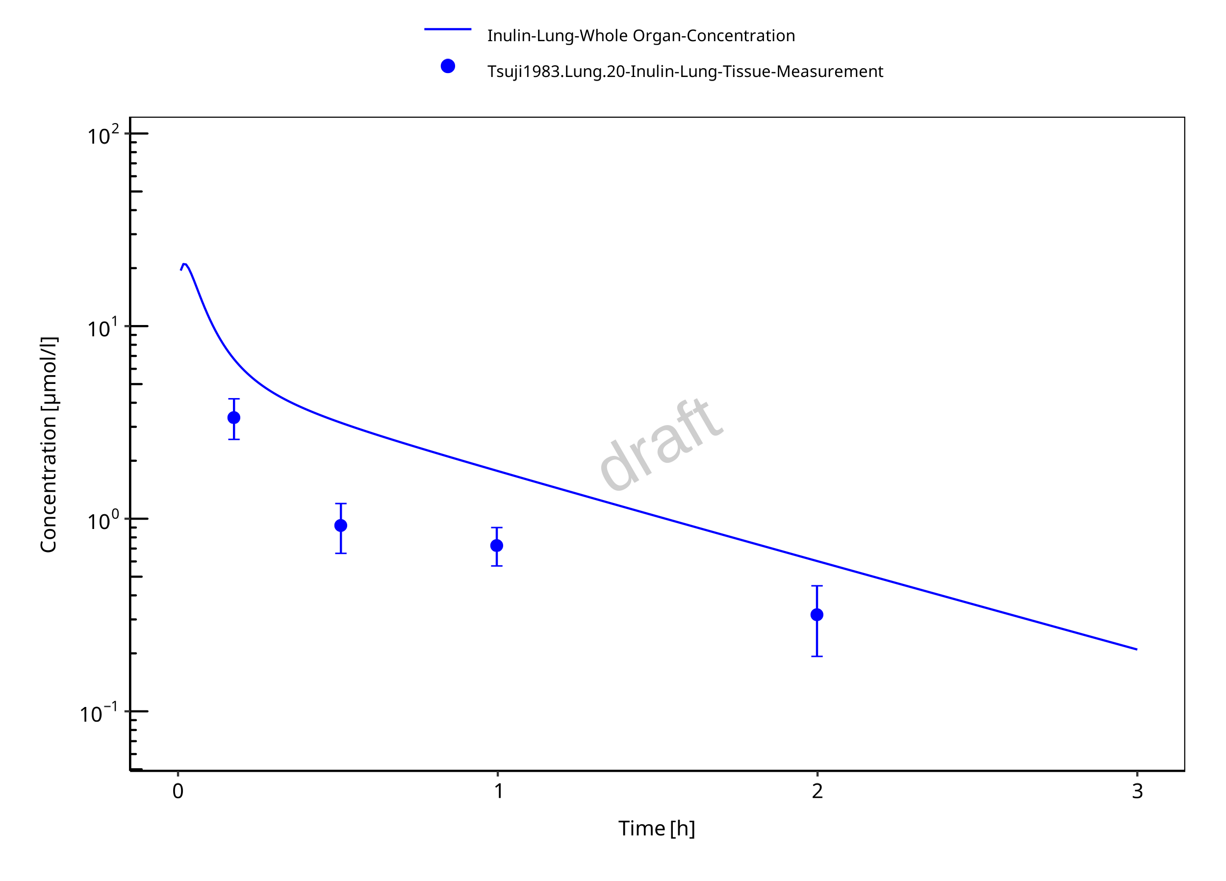 The herein presented PBPK model overall adequately describes the plasma pharmacokinetics of inulin in rats. Tissue concentrations tend to be overestimated by the model, the largest deviations being observed for lung, gut, and heart concentrations. Simulations are predictions without adjusting any compound specific parameter (i.e., using a literature value for the solute radius of inulin and the default physiological parameters in PK-Sim especially for the glomerular filtration rate, vascular properties and compartment volumes).