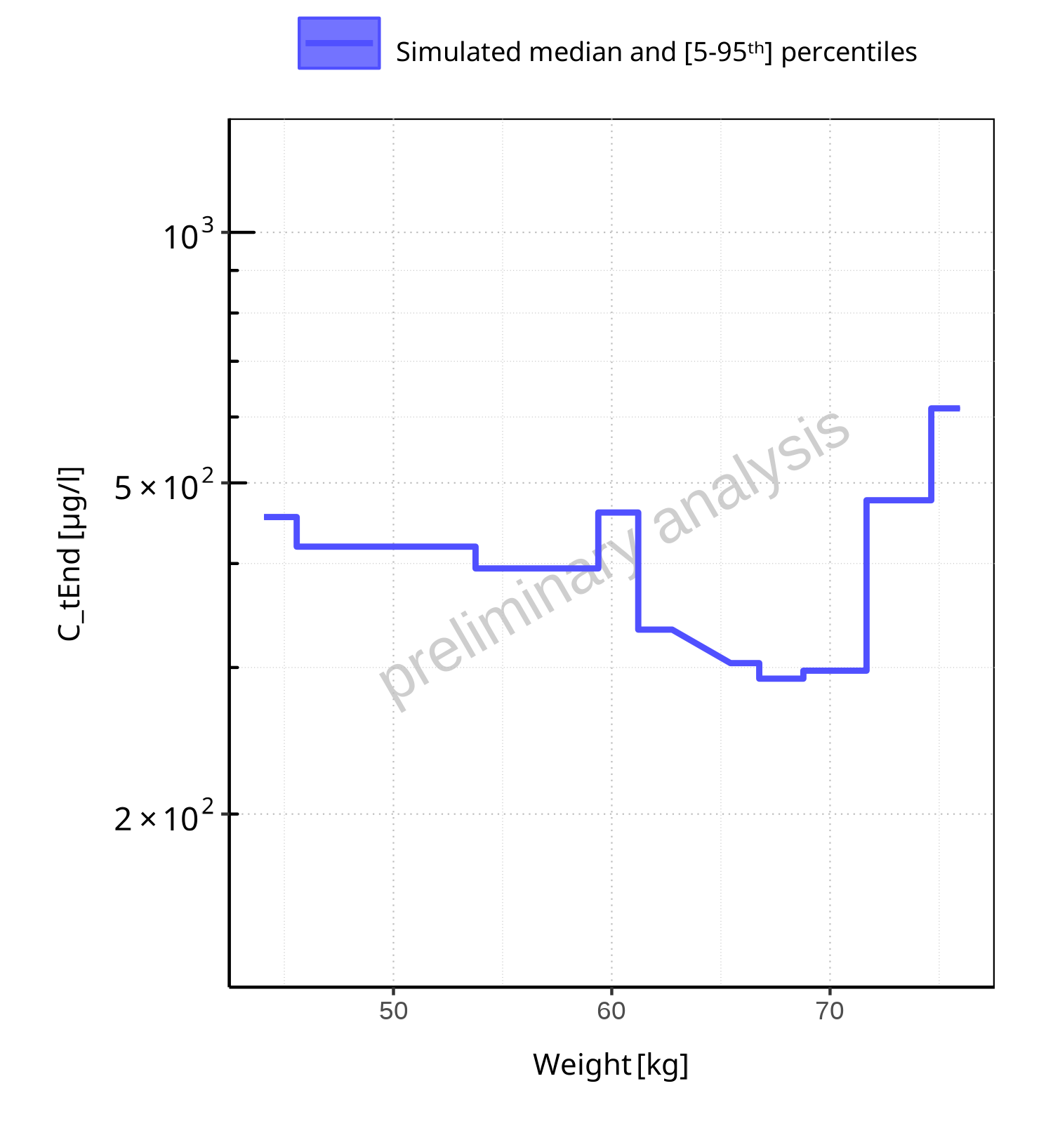 Figure 1-37: Weight-dependence of AUC_tEnd for single IV administration. Profiles are plotted in a logarithmic scale.
