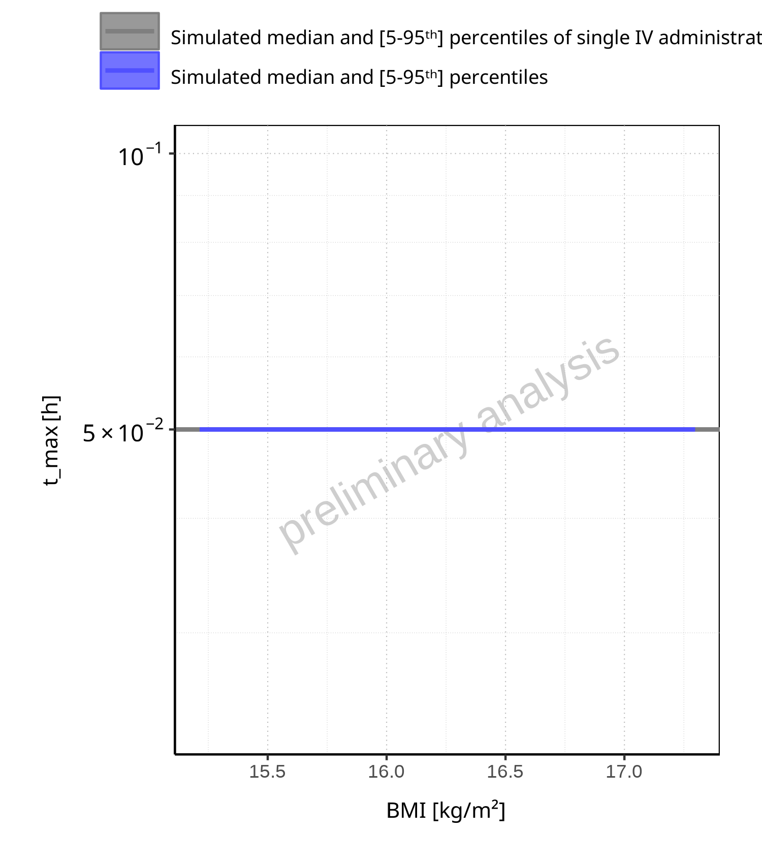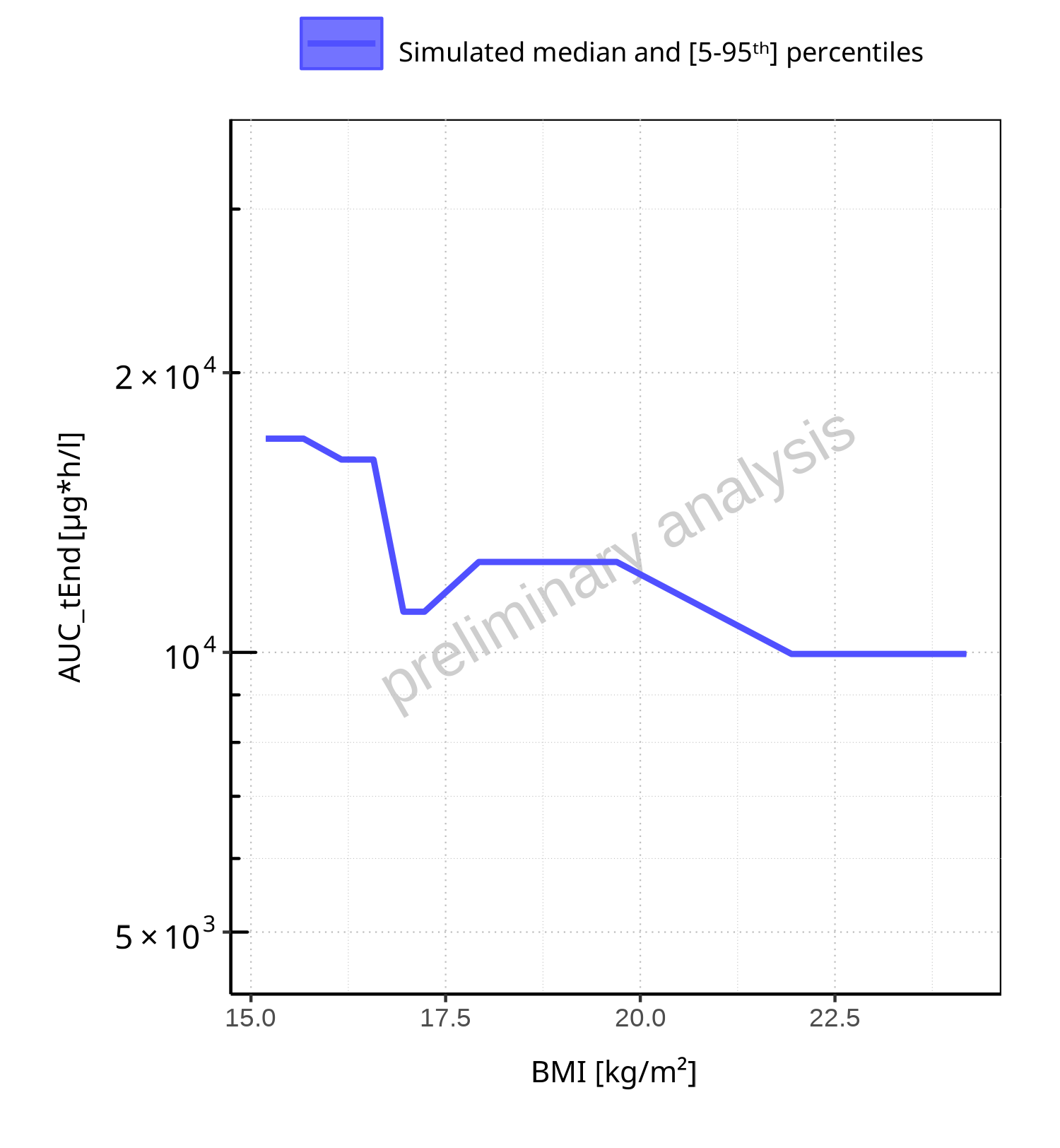 Figure 1-51: BMI-dependence of AUC_tEnd for single IV administration. Profiles are plotted in a logarithmic scale.