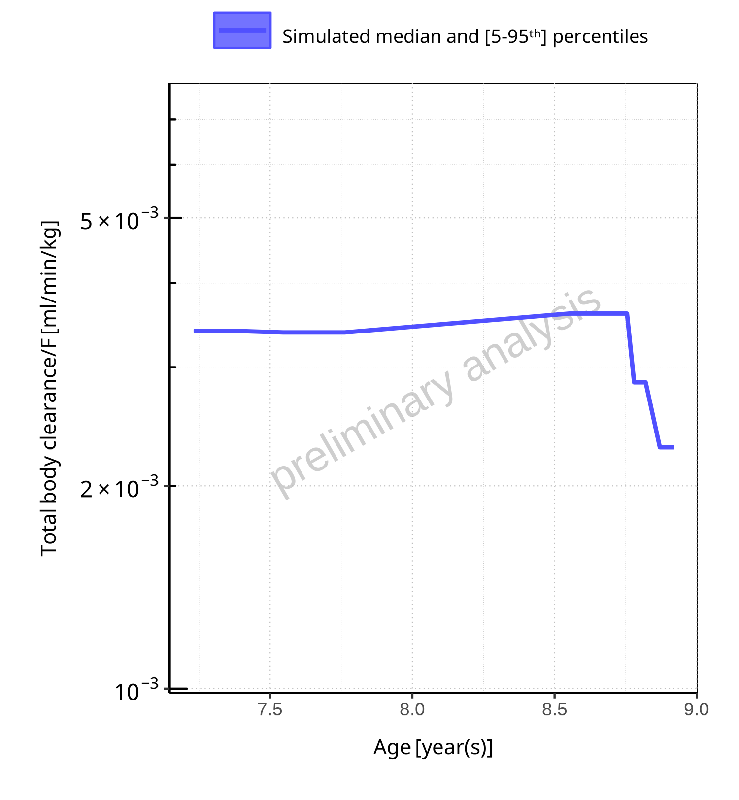 Figure 1-293: BMI-dependence of Total body clearance/F for children_0_3y. Profiles are plotted in a logarithmic scale.