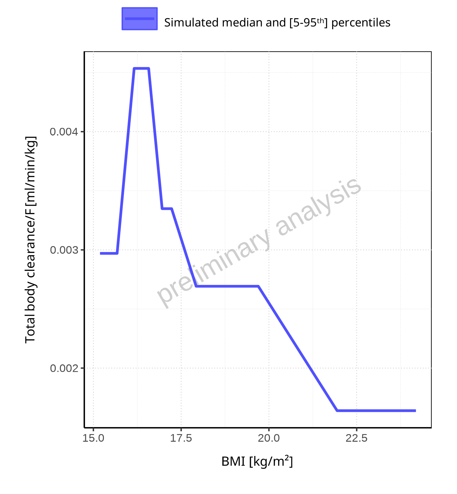 Figure 1-292: BMI-dependence of Total body clearance/F for single IV administration. Profiles are plotted in a linear scale.