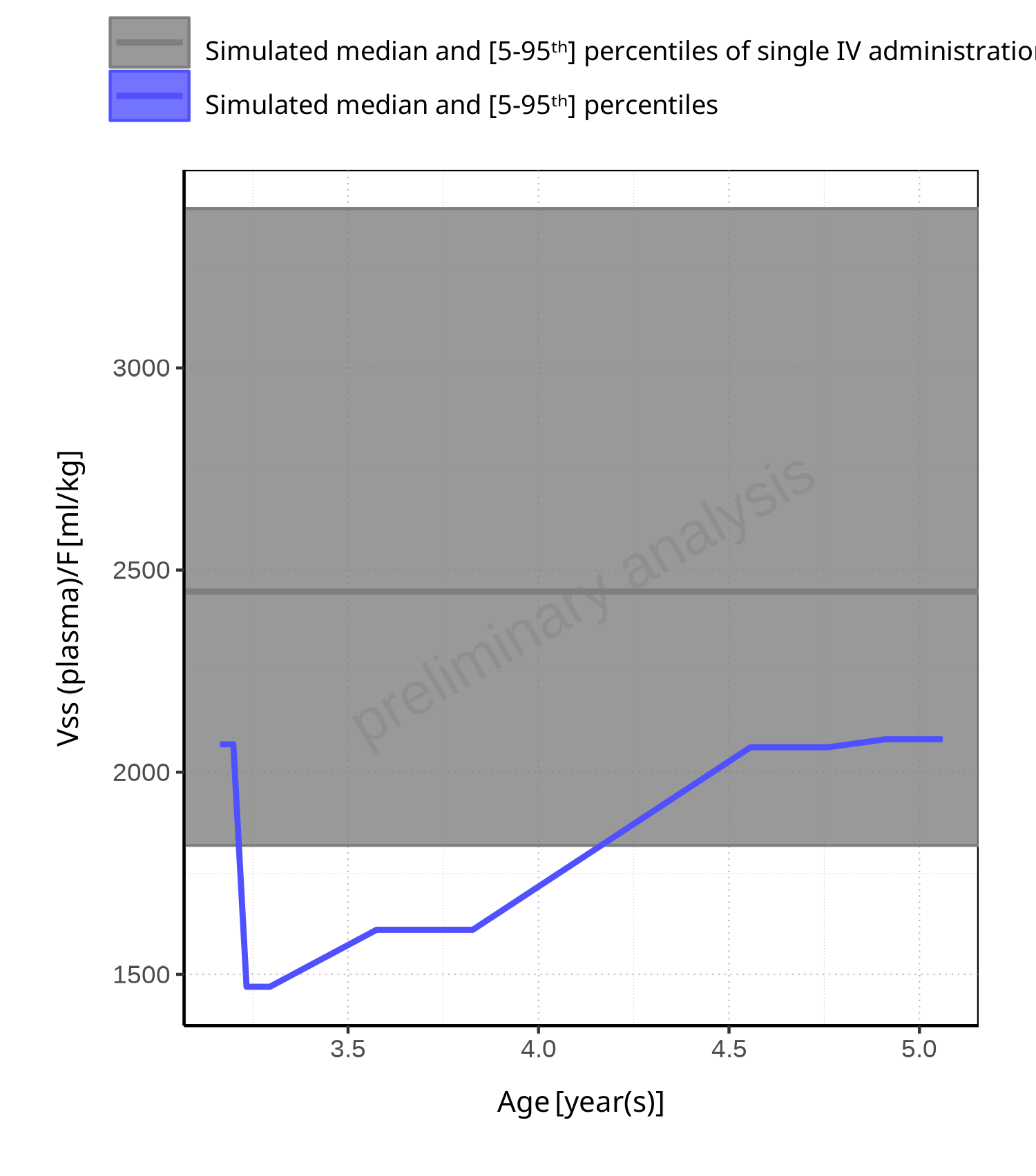 Figure 1-306: Age-dependence of Vss (plasma)/F for children_3_6y in comparison to single IV administration. Profiles are plotted in a linear scale.