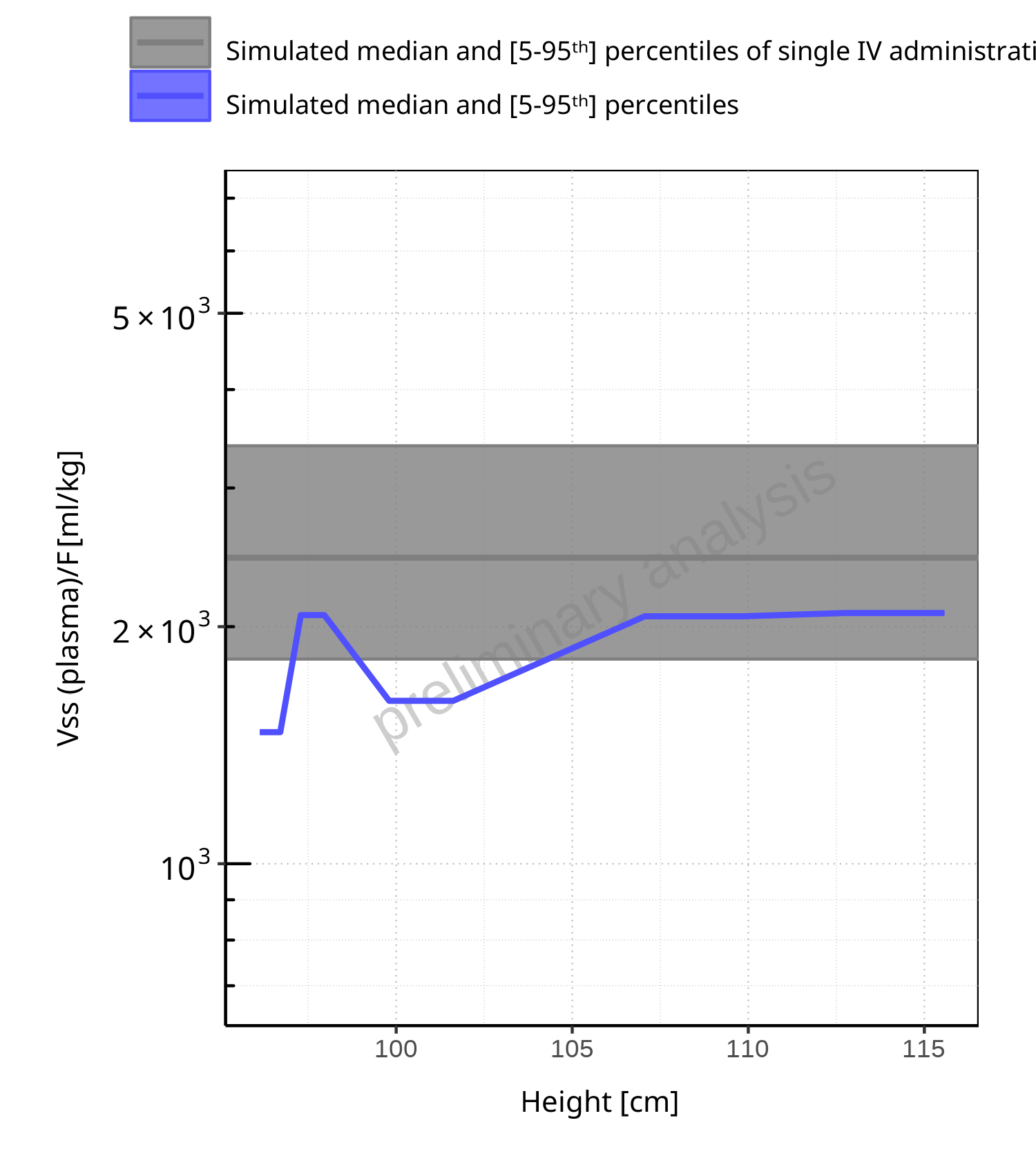 Figure 1-319: Height-dependence of Vss (plasma)/F for children_3_6y in comparison to single IV administration. Profiles are plotted in a logarithmic scale.