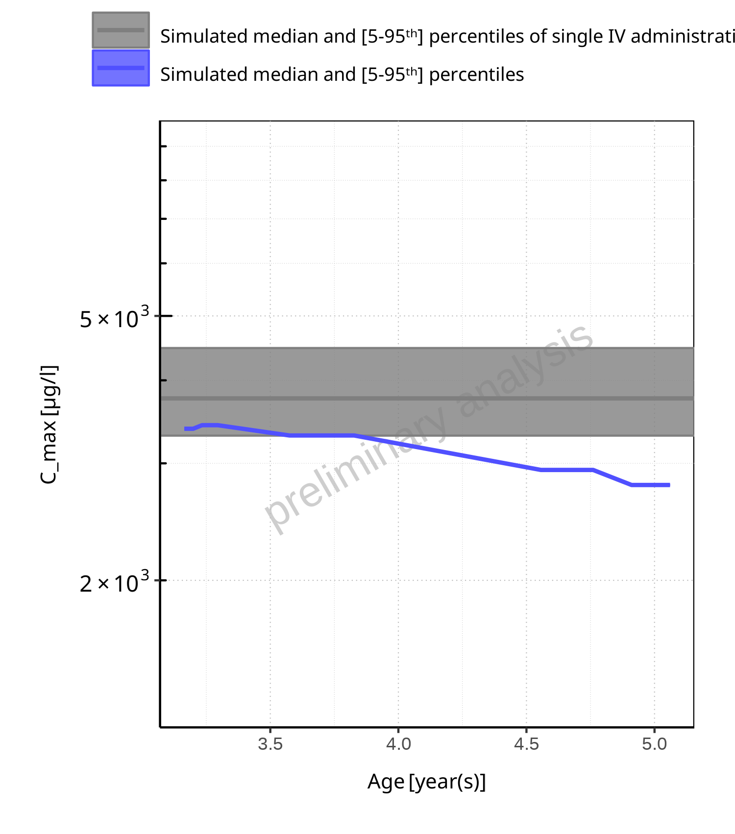 Figure 1-65: Age-dependence of C_max for children_3_6y in comparison to single IV administration. Profiles are plotted in a logarithmic scale.