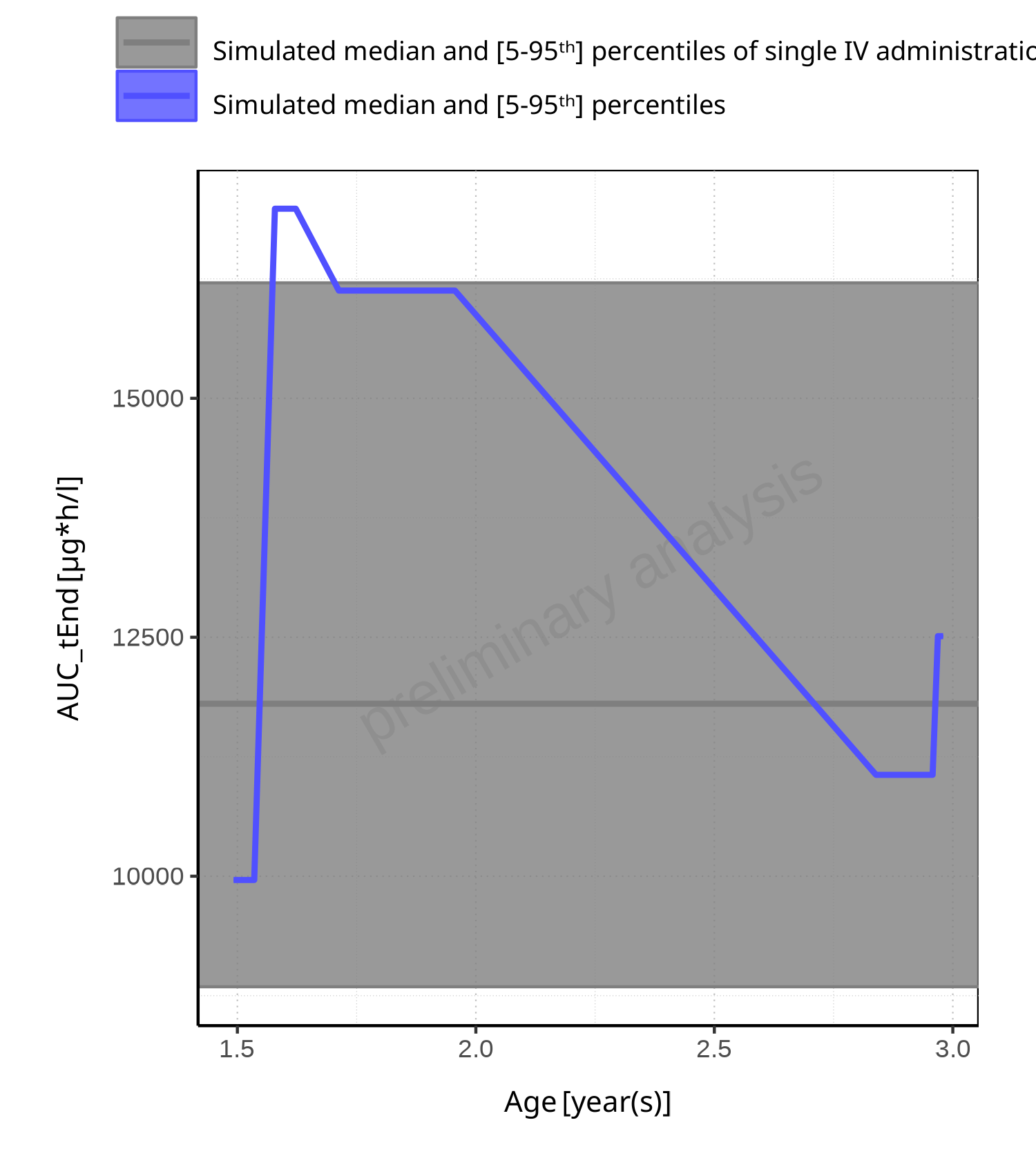 Figure 1-4: Age-dependence of AUC_tEnd for children_0_3y in comparison to single IV administration. Profiles are plotted in a linear scale.